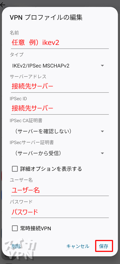 ※「サーバーアドレス」「IPSec ID」は同じ値を入力